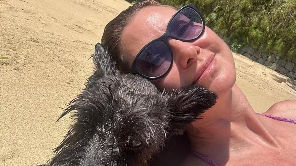 Lavínia Vlasak, 48 anos, compartilhou fotos usando biquíni lilás em uma praia do Rio de Janeiro, ao lado de seu cãozinho em seu Instagram. “Entre