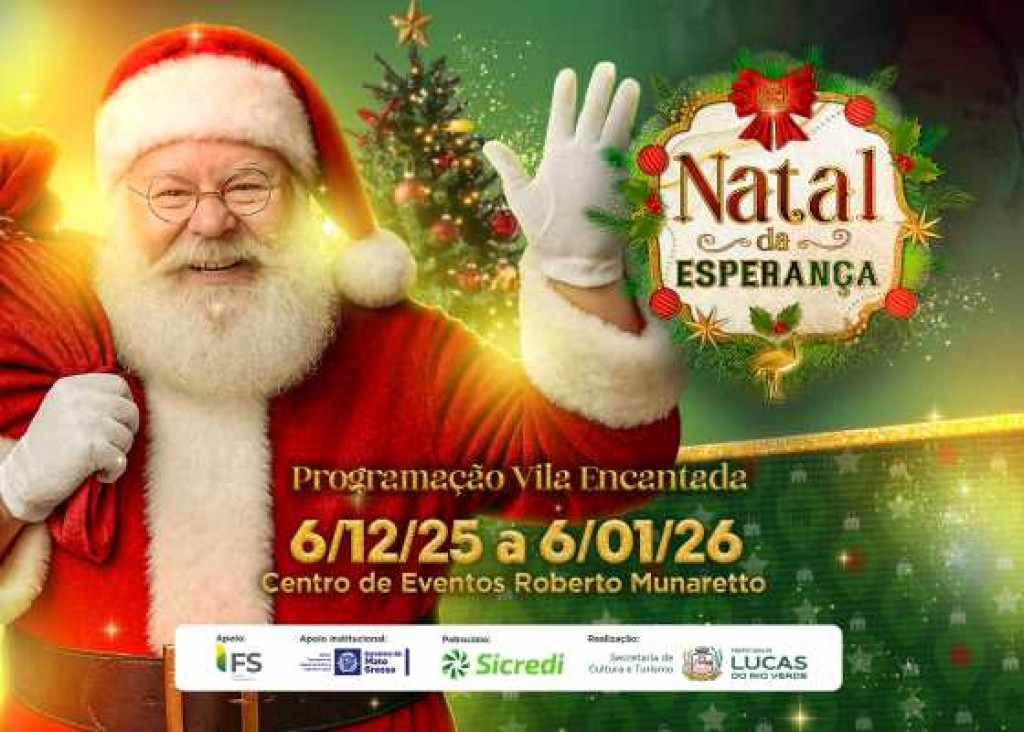 A Prefeitura de Lucas do Rio Verde, por meio da Secretaria de Cultura e Turismo, dá um start inicial no Natal da Esperança 2025 neste sábado (06), às 19h, no Centro de Eventos Roberto Munaretto. Neste ano, a 5ª edição conta com o patrocínio do Sicredi Ouro Verde e apoio da FS.