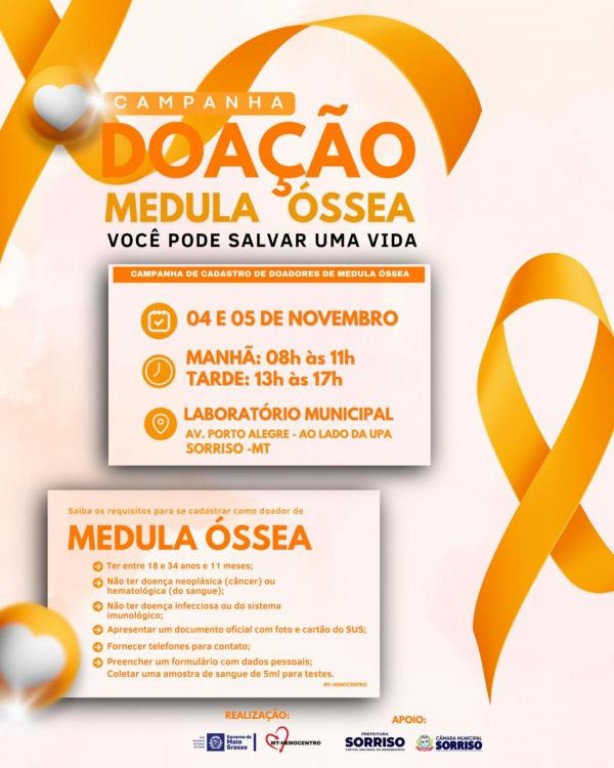 A solidariedade é a palavra-chave para os dias 04 e 05 de novembro, quando a Prefeitura e Câmara Municipal de Sorriso, em parceria com o MT-Hemocentro, promove a importante Campanha de Cadastro de Doadores de Medula Óssea. A iniciativa visa ampliar o Registro Nacional de Doadores Voluntários de Medula Óssea (REDOME) e aumentar as chances de pacientes em todo o país encontrarem um doador compatível, um passo crucial para o tratamento de doenças graves como leucemia, linfomas e alguns tipos de anemia.