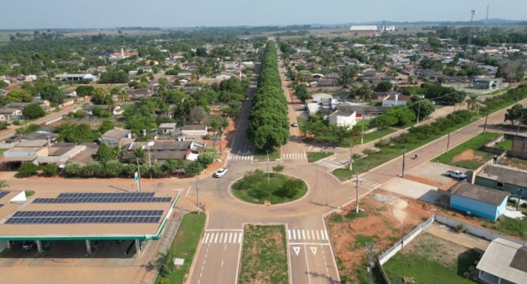 #PraTodosVerem – A imagem, capturada de uma perspectiva aérea, mostra um trecho urbano e semiurbano que se estende ao redor de uma rotatória central do município de Carlinda. Uma longa e reta avenida arborizada, ladeada por copas densas de árvores, divide o cenário e se prolonga em direção ao horizonte. No primeiro plano, à esquerda, há um posto de combustível coberto por painéis solares. As áreas residenciais circundantes são caracterizadas por casas de um ou dois andares, com telhados claros e muita vegetação, indicando um ambiente tropical ou subtropical. O solo em algumas áreas abertas e canteiros centrais apresenta uma tonalidade de terra vermelha, típica de certas regiões do Brasil.