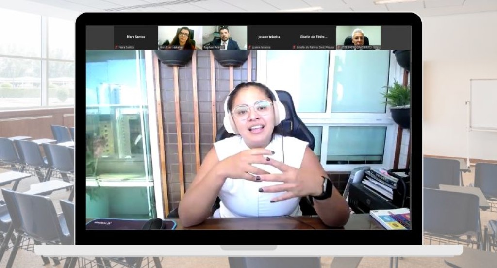 #PraTodosVerem: A imagem mostra uma videoconferência exibida na tela de um notebook, em que uma mulher, usando fones de ouvido e óculos, fala de forma expressiva durante sua participação. No topo, aparecem as janelas com outros participantes da reunião virtual. Ao fundo, é possível ver que a montagem simula um ambiente de sala de aula, reforçando o caráter educativo e institucional do encontro online.