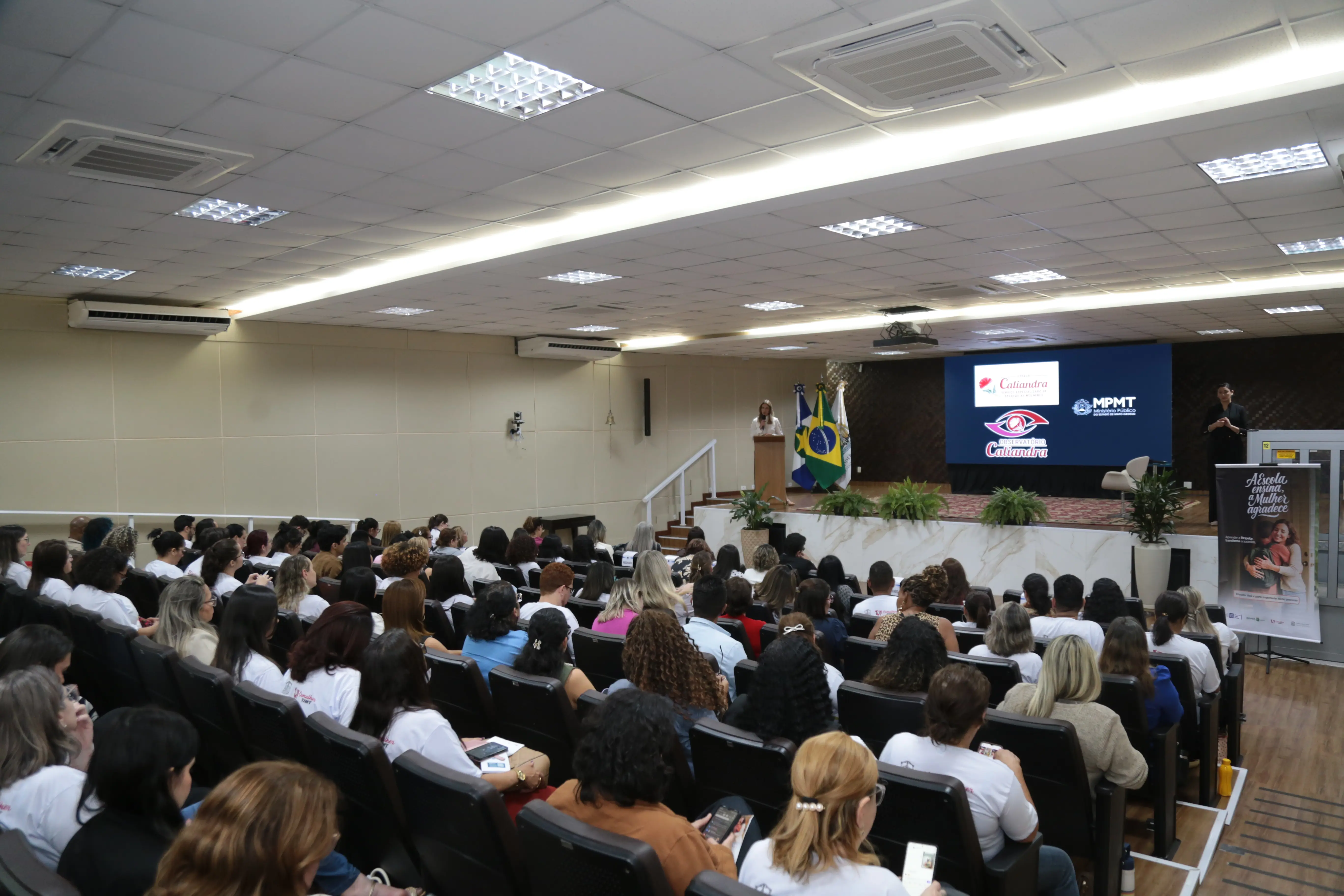 Na sexta-feira (15 de agosto), o Tribunal de Justiça de Mato Grosso (TJMT) realizou a segunda capacitação do projeto “A escola ensina, a mulher agradece”, para 190 professores e diretores de escolas estaduais. O evento, que ocorreu no auditório do TJMT em Cuiabá, abordou o combate à violência de gênero com palestras ministradas por especialistas no assunto. Uma delas foi conduzida pela delegada Judá Maali Pinheiro Marcondes, titular da Delegacia Especial em Defesa da Mulher de Cuiabá, que falou sobre “A Denúncia dos Atos de Violência contra a Mulher”.