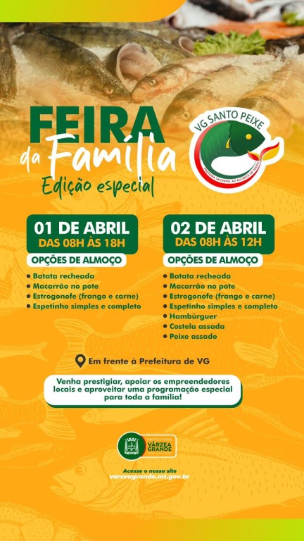 A Feira da Família terá edições especiais nesta semana em Várzea Grande, integrando a programação do “VG Santo Peixe” e oferecendo ao público uma variedade de produtos e opções gastronômicas. Excepcionalmente neste mês de abril, a feira será realizada em dois dias, nesta quarta-feira (1º), das 8h às 18h, e na quinta-feira (2), das 8h às 12h.
