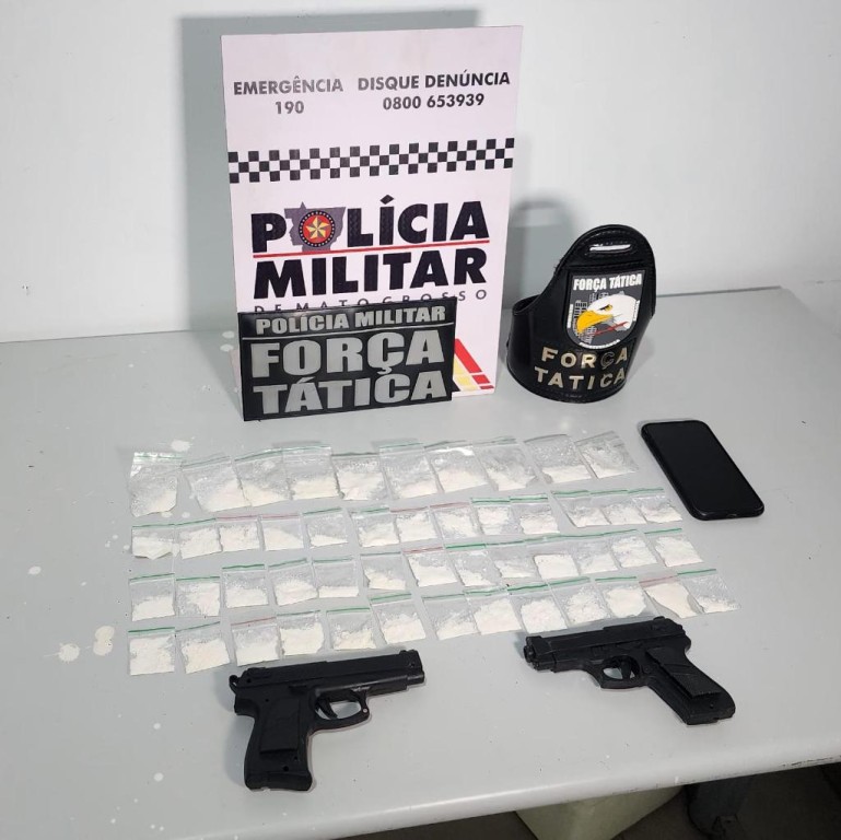 Policiais militares da Força Tática do 7º Comando Regional prenderam dois homens, de 18 e 20 anos, por ameaça e tráfico ilícito de drogas, nesta quinta-feira (20.3), em Tangará da Serra. Os suspeitos estariam ameaçando professores e alunos de uma escola. Com eles, foram encontradas dois simulacros de arma de fogo e 49 porções de cocaína.