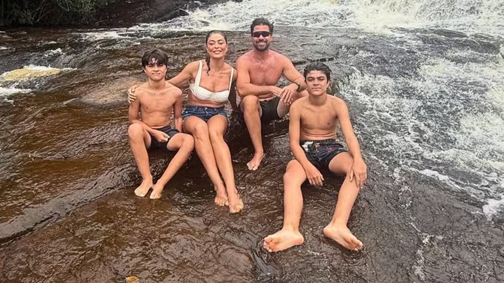 A artista levou a família para curtir o destino turístico. Ela posou com o marido, Carlos Eduardo Baptista, e com os filhos, Pedro, de 14 anos, e Antônio, de 11, durante uma refeição.