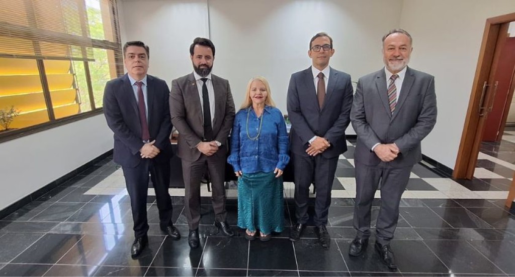 #PraTodosVerem – A imagem mostra cinco pessoas em pé, alinhadas lado a lado em um ambiente interno com piso de mármore preto e branco e paredes claras. Quatro homens, vestidos com ternos escuros, gravata e sapatos sociais, ladeiam uma mulher ao centro, que usa blusa azul e saia longa verde. Ao fundo, há uma janela com persianas amarelas e uma porta de madeira aberta à direita. O cenário transmite formalidade, sugerindo um encontro institucional ou solenidade.