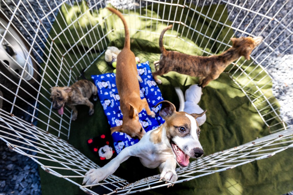 A imagem mostra um cercado em grande com quatro cães sem raças definidas que estão disponíveis para adoção na Bem-Estar Animal. No espaço tem uma almofada na cor azul disposta no centro do espaço e brinquedo de pelúcia para os animais. Eles demonstram estar alegres.