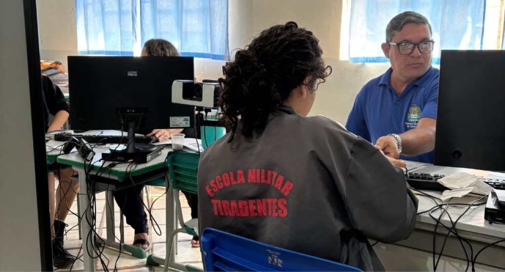 #PraTodosVerem: A imagem mostra um atendimento eleitoral sendo realizado em uma sala. Uma jovem, vestindo uma jaqueta com a inscrição “Escola Militar Tiradentes” nas costas, está sentada diante de um computador, enquanto um servidor da Justiça Eleitoral, de óculos e camisa azul, conduz o procedimento. Ao fundo, há outros equipamentos e pessoas em atendimento.
