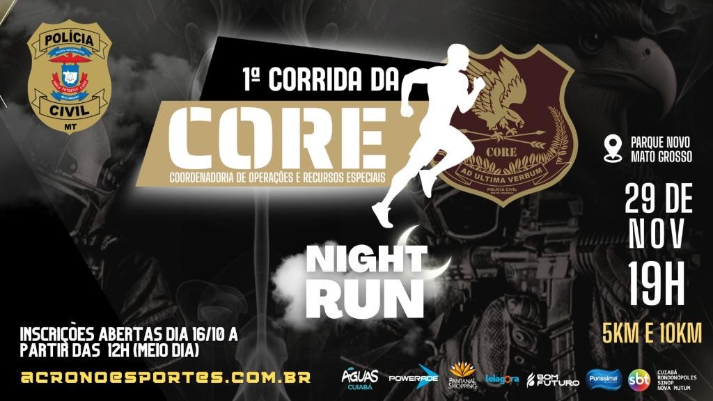 A partir desta quinta-feira (16.10), estarão abertas as inscrições para a “1ª Corrida da Core”. Organizado pela Polícia Civil, por meio da Coordenadoria de Operações e Recursos Especiais (Core), o evento esportivo será realizado no dia 29 de novembro (sábado), no Parque Novo Mato Grosso, na rodovia MT-251, que liga Cuiabá a Chapada dos Guimarães.
