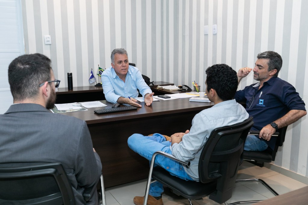Quatro homens estão reunidos em uma sala de escritório. Um deles, sentado atrás de uma mesa de madeira escura, é o secretário Reginaldo, ele usa uma camisa azul clara e explica algo para os demais que estão sentados à sua frente. Na mesa, há papéis, um teclado de computador e uma bandeira do Brasil.