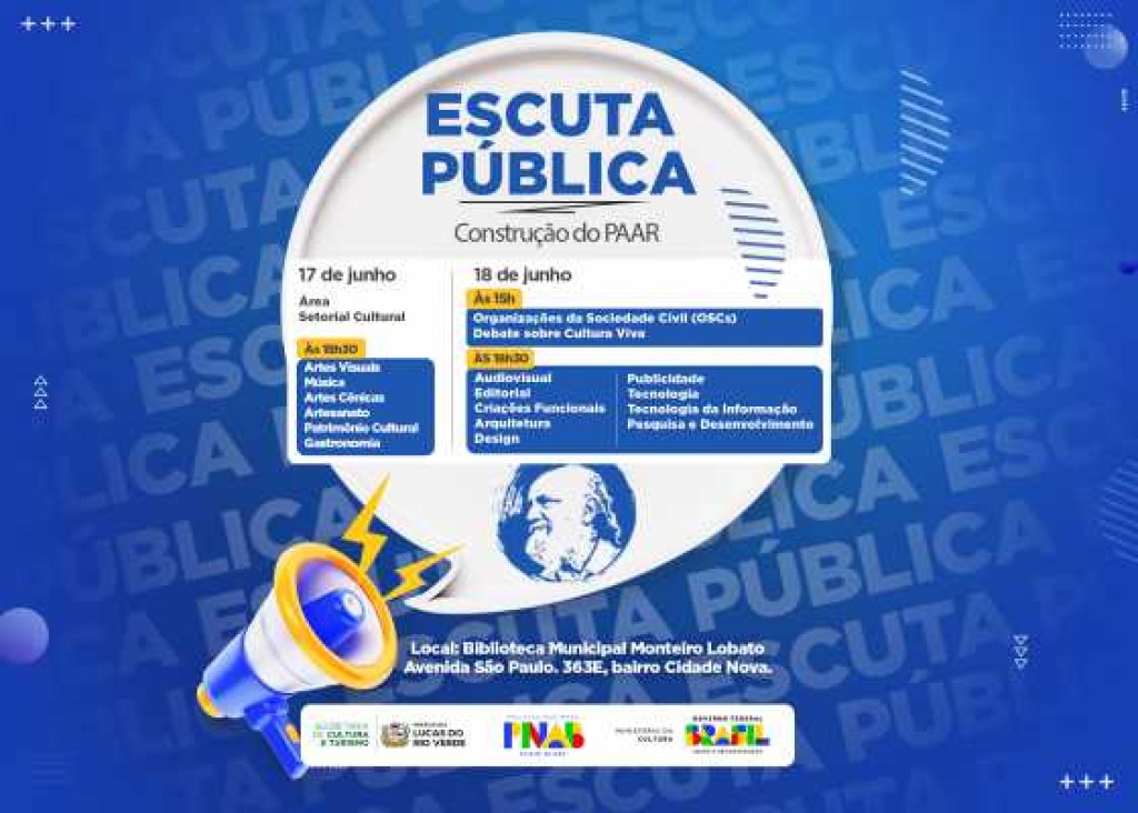 A Prefeitura de Lucas do Rio Verde, por meio da Secretaria de Cultura e Turismo realizará, nos dias 17 e 18 de junho, uma escuta ativa com os artistas locais para ouvir sugestões e ideias que contribuirão na elaboração do Plano Anual de Aplicação de Recursos (PAAR), da Política Nacional Aldir Blanc (PNAB).