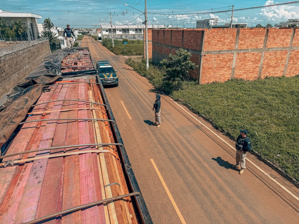 Durante a abordagem de um conjunto de veículos de carga, os policiais constataram o transporte de 70,21 m³ de madeira sem a devida documentação florestal.