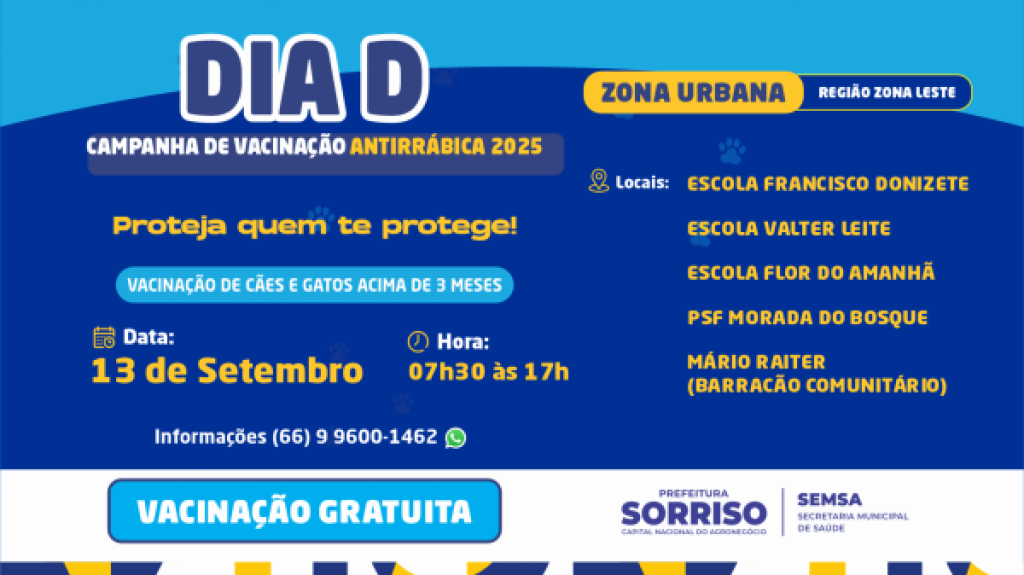 Com o tema “Proteja quem te protege”, neste sábado, 13 de setembro, a Secretaria Municipal de Saúde promove o Dia D da Campanha de Vacinação Antirrábica na região Leste de Sorriso. A mobilização será realizada das 7h30 às 17h, em cinco pontos estratégicos: