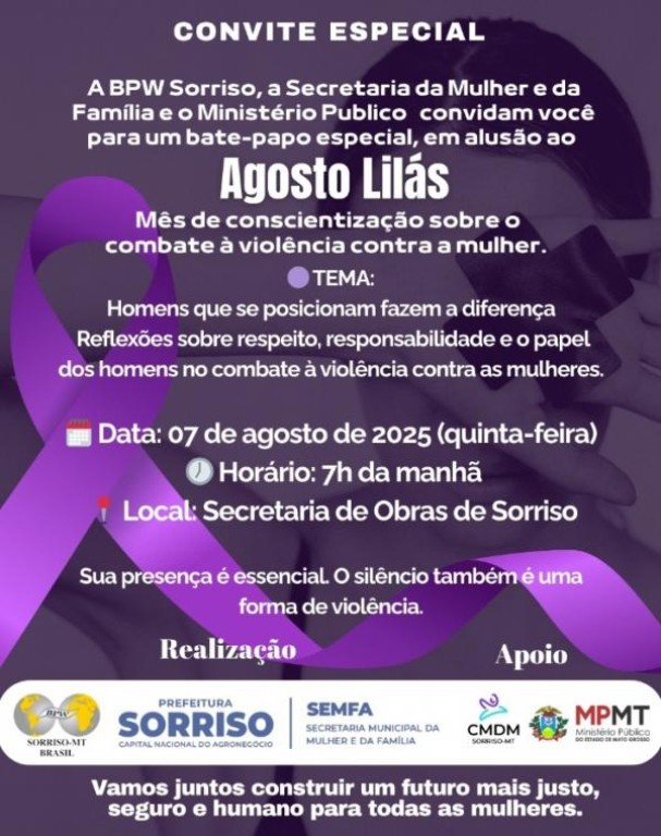 O evento na Sintra abrirá as discussões do Agosto Lilás. No Município o trabalho será realizado em parceria pela Prefeitura por meio da Semfa, Conselho Municipal dos Direitos da Mulher, Ministério Público e Associação Mulheres de Negócios e Profissionais (BPW), núcleo de Sorriso.
