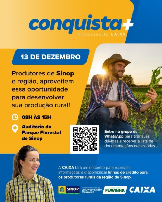 O evento, denominado “Conquista+Caixa – Edição Sinop”, ocorrerá no auditório do Parque Natural Florestal Municipal — localizado na Rua das Orquídeas, no Jardim Primaveras — das 8h às 15h, e contará com a presença da assessora especial do Mapa e deputada federal Flávia Rodrigues, responsável pela articulação do evento. Ela destaca que o encontro é fundamental para o setor, haja vista que a produção rural de Sinop tem força, futuro e história.