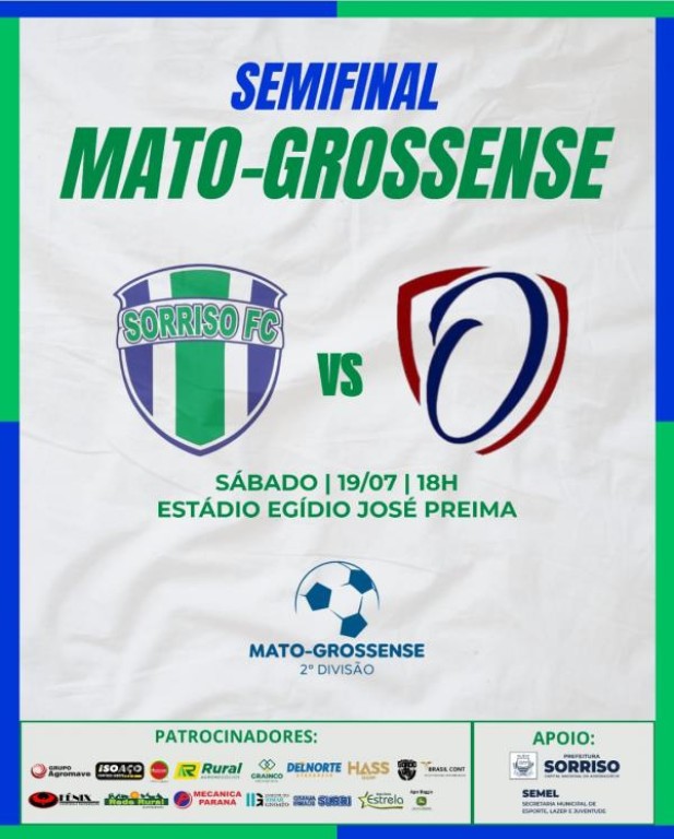 Neste sábado (19), às 18 horas, o Sorriso Futebol Clube entra em campo pela partida de volta da semifinal do Campeonato Mato-grossense da 2ª Divisão. O jogo será realizado no Estádio Municipal Egídio José Preima, em Sorriso, com ingressos disponíveis para compra na bilheteria do local.