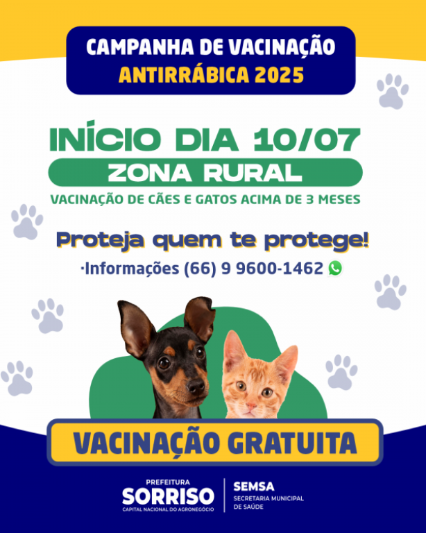 A Campanha de Vacinação Antirrábica Animal terá início nesta quinta-feira (10), com as primeiras ações sendo realizadas na zona rural do Município. A vacinação é destinada a cães e gatos a partir de três meses e é uma das principais estratégias para prevenção e controle da raiva, protegendo tanto os animais quanto a população humana contra a circulação do vírus rábico. A meta é imunizar 18.000 cães e 5.000 gatos entre áreas rurais e periurbanas do Município.